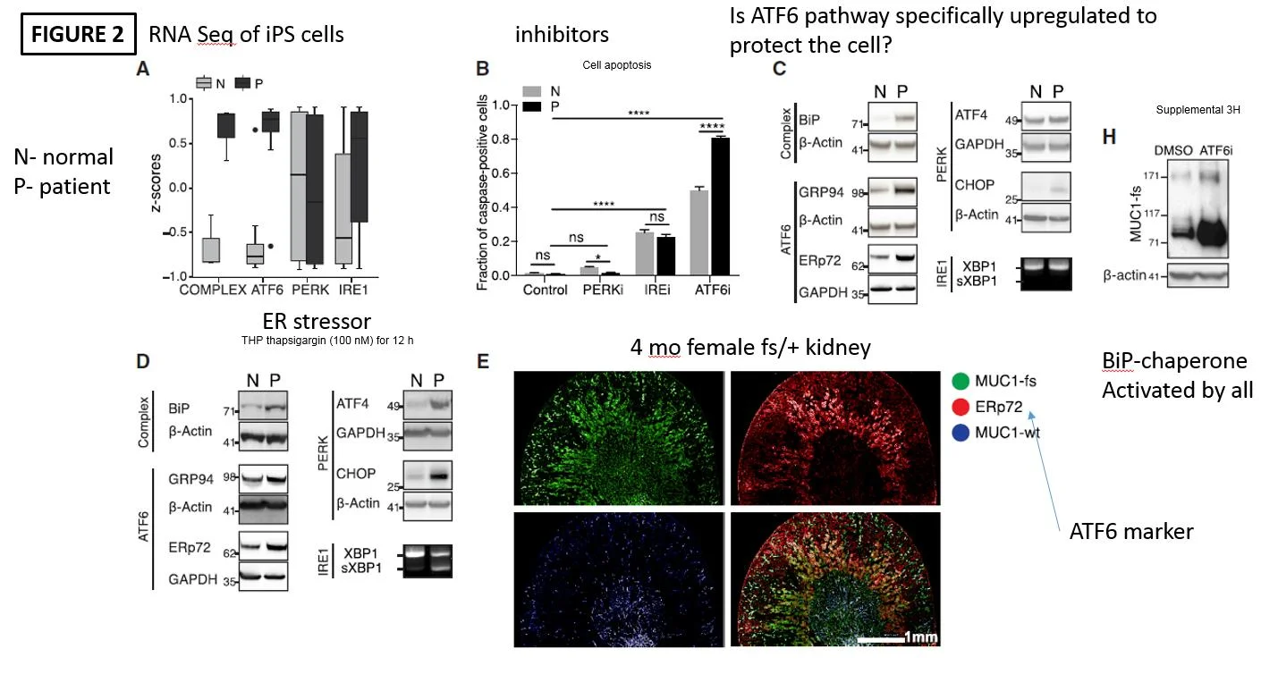 The next step was to understand what exactly is going on with the unfolded protein response (UPR) in MKD. This is a cellular response all cells have to deal with protein debris (misfolded and damaged proteins). This can range from pushing proteins to degratory pathways in lysosomes to apoptosis and cell death. To do this they utilized P and N cells and performed RNA sequencing. As seen in figure 2A they demonstrated enhanced complex and ATF6 pathways in P cells as compared to N cells. This suggests that both of these pathways are enhanced in patients with MUC1 mutations. To review. The ATF6 pathway is one of 3 pathways utilized in the UPR. Potentially, the ATF6 pathway upregulation is a protective mechanism to deal with the MUC1-fs. They went on to give inhibitors of each of the pathways as seen in Figure 2B. The showed that the ATF6 pathway when inhibited resulted in more apoptosis in P compared to N cells. Again, pointing to ATF6 being upregulated and potentially protective in MKD. The rest of the figure goes on to (C) show more evidence of ATF6 pathways upregulated and (D) the application of an ER stressors (thapsigarin) resulted in P cells being more sensitive and finally (E) in the mice with human MUC1-fs having colocaliation with the ATF6 marker ERp72. These findings all point toward an upregulated ATF7 UPR pathway in MKD.
