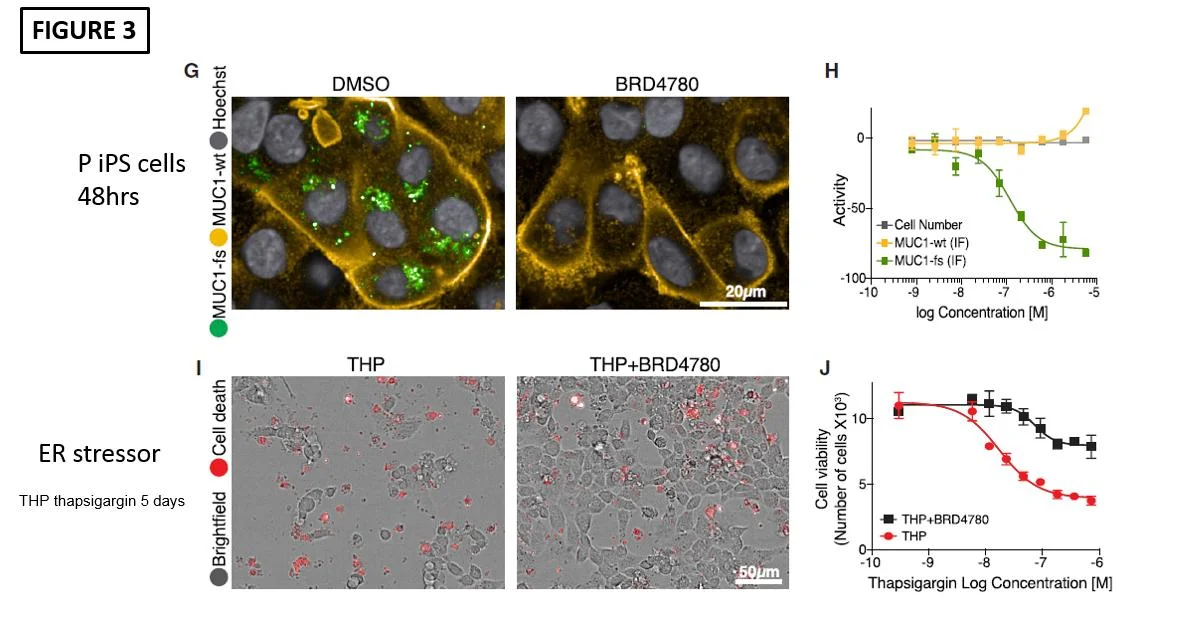 Then the investigators first administered BRD4780 to P cells and found that MUC1-fs indeed was diminished after 48 hours (Figure 3G). In addition, coadministration of the ER stressor, thapsigargin, with BRD4780 resulted in much less cell death (Figure 3I). They also showed that treating mice (via oral gavage) with expression of human MUC1-fs also demonstrated diminished MUC1-fs levels.