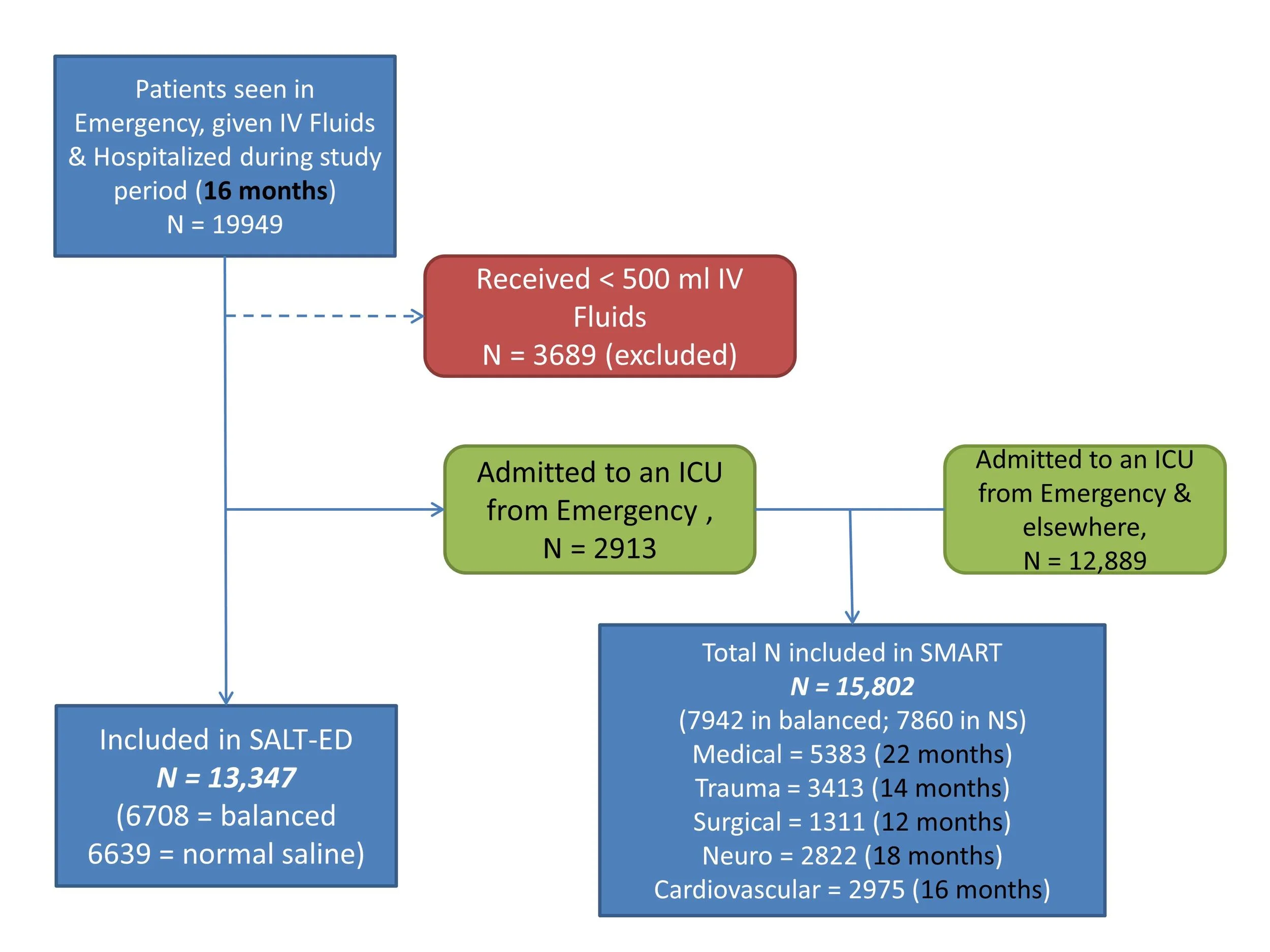 SALT-ED enrolled patients in the Emergency department, who received at least 500 ml crystalloids, and were hospitalized, over a period of 16 months (so alternating 8 cycles of saline and balanced crystalloids).