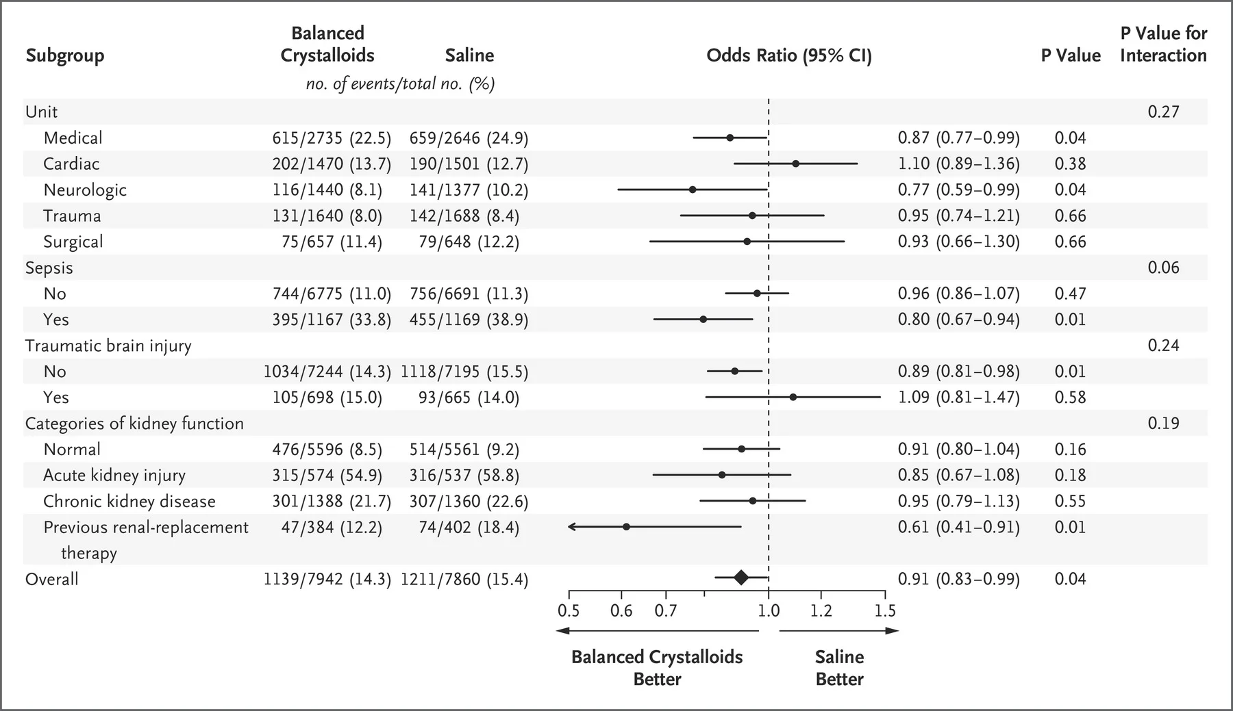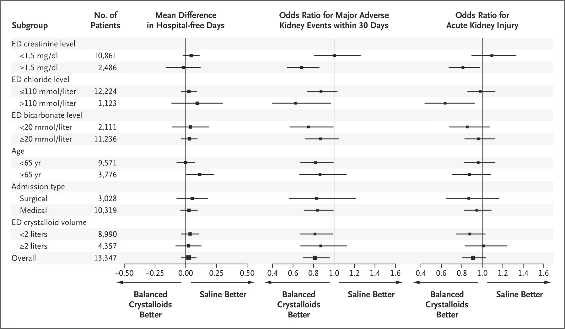 So should we switch over to using balanced solutions? What explains the difference between these results versus the smaller, but perhaps better designed SPLIT? The volumes of IVF were similar - could something about the solution itself (Plasmalyte versus Ringer's) explain the difference? There is little downside to using balanced solutions - a small cost difference of a few cents, and there is no signal of balanced solutions being worse. Or do you want to wait for the randomized and blinded trial of higher risk patients (N = 8300) aka the PLUS trial? Or the FLUID trial, N = 65,000, another cluster RCT? Or maybe the BEST FLUID trial, specifically aimed at DGF? Or the even larger BASICS trial, from Brazil? Join us to discuss