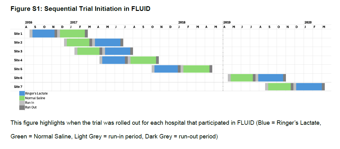 This was a cluster-randomized trial, done in Ontario, a Canadian province. The randomization was the order; some hospitals got saline before Ringer's and others got Ringer’s before saline. Every patient walking into the hospital for the 12-week period received this assigned fluid, as shown below in Figure S1. Being a cluster RCT, there’s no consent, there’s no eligibility (everyone gets this fluid), and outcomes are collected from the provincial administrative database at a very high level. See this #NephTrials discussion for what a cluster RCT entails and the implications.