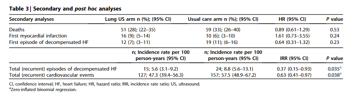 The total number of repeated episodes of decompensated HF and repeated cardiovascular events in both arms showed a significant decrease in the lung US arm compared to the usual care arm (Table 3).