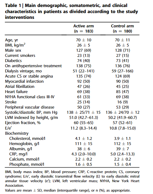 Most of the study participants were receiving pharmacologic therapy for hypertension and cardiovascular comorbidities. Demographics and clinical characteristics of the study participants were depicted in table 1. About 70% were men, with 40% diabetes, and about 15% active smokers. The median dialysis vintage was about 4-5 years. Since it was part of the eligibility, about 70-75% had a history of ACS or angina and about 38-47% (in each arm) had a history of heart failure.