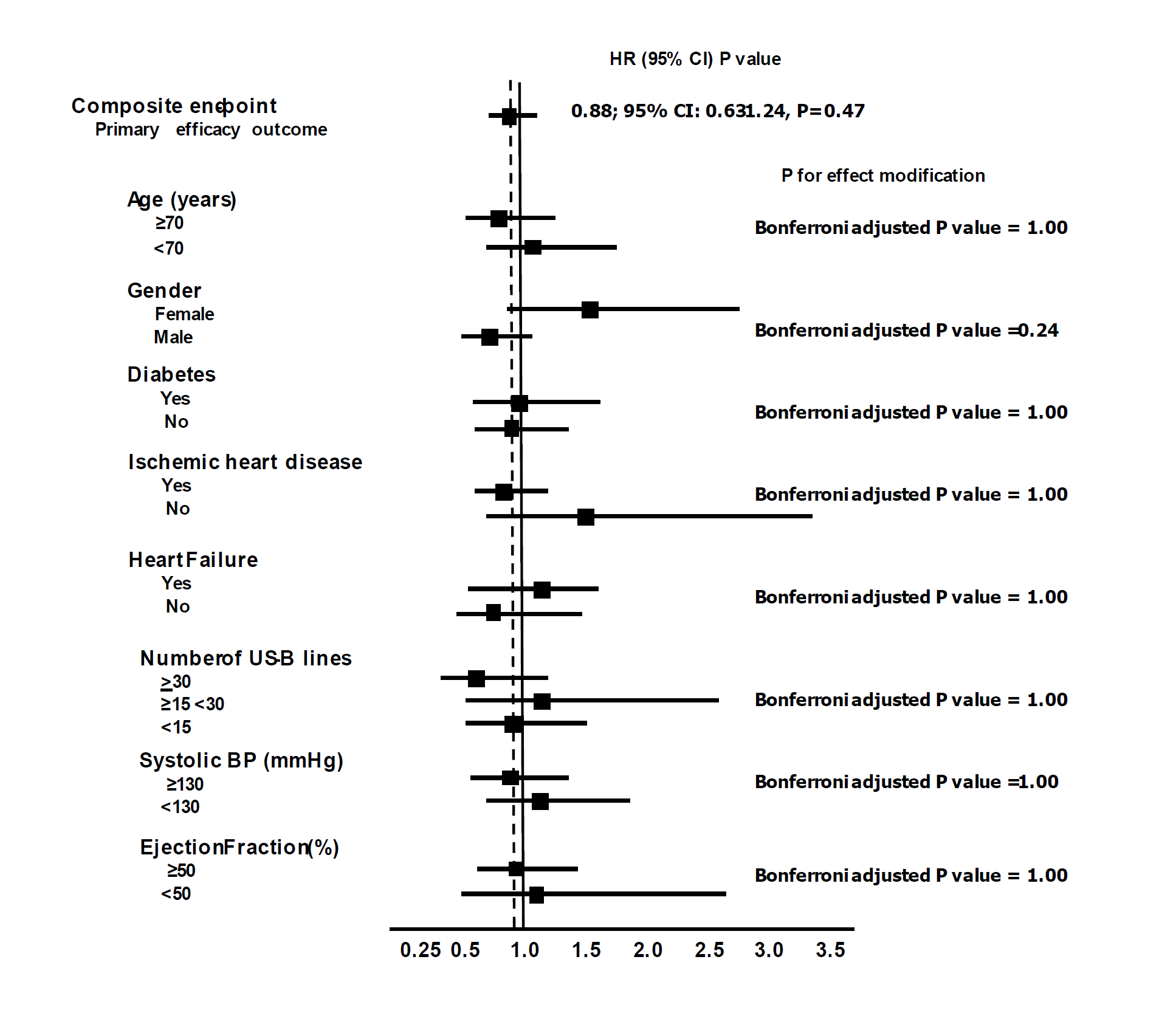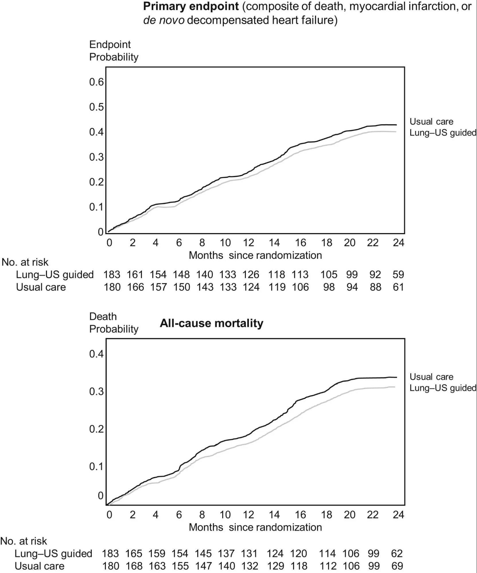 The composite endpoint occurring in 62 patients in the active arm and 71 patients in the control arm during a mean follow-up of 1.5 years years was not statistically significant (HR 0.88; 95%CI 0.63-1.24, p= 0.47), see figure 3 below. Death occurred in 28% of patients in the lung US-guided therapy group compared to 33% in the usual care group which was also not statistically significant.