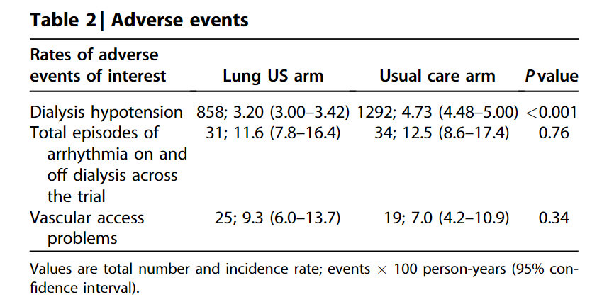 The lung US based therapy was safe and risk of dialysis hypotension was less in the active arm and vascular access related problems, intradialysis and extra-dialysis arrhythmia did not differ between two groups (see some adverse events reported in table 2).