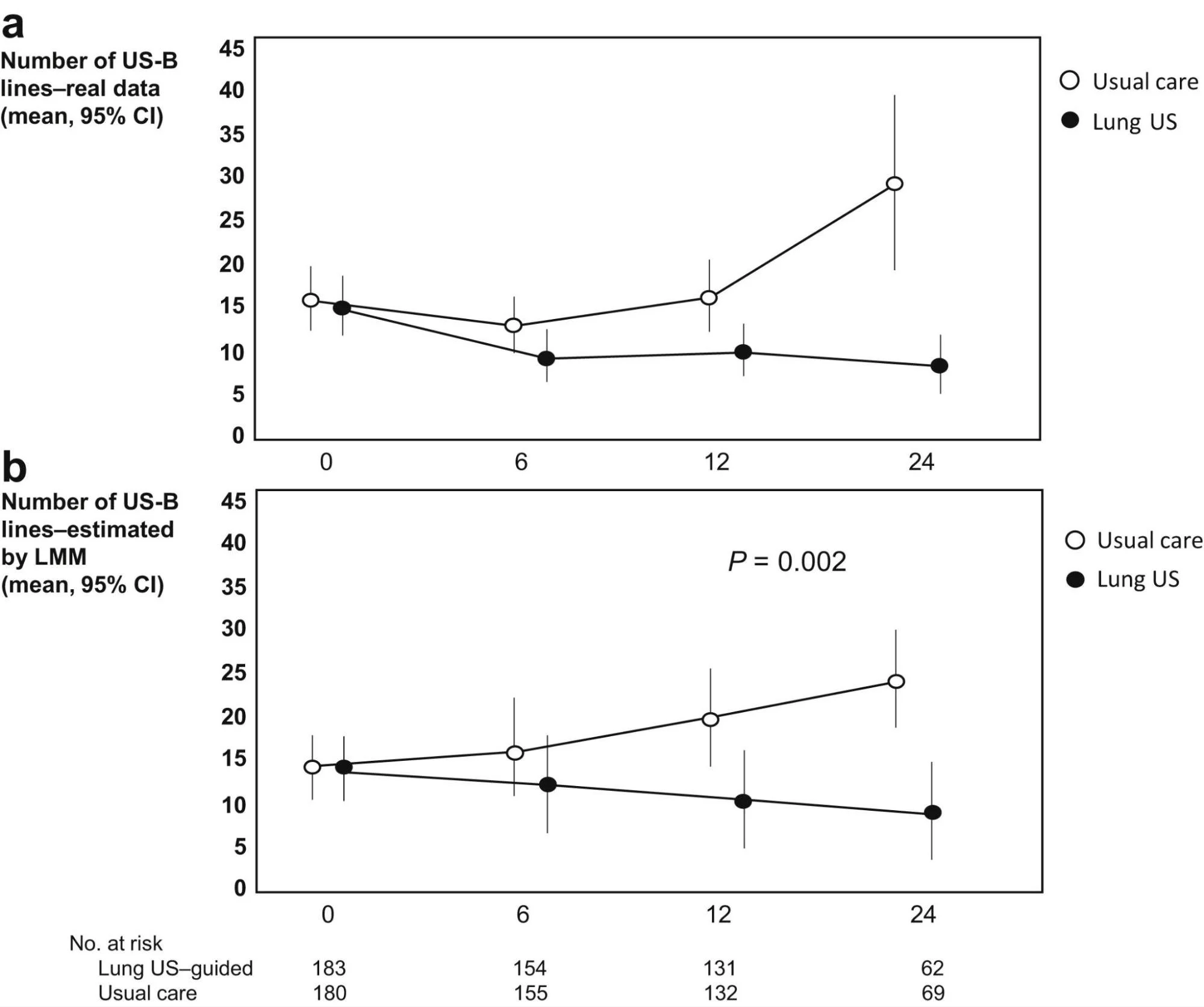 All the patients were followed up for 24 months after randomization. A Cox regression hazard ratio (HR) and Kaplan-Meier method was used to analyze the effect of the intervention on the primary, composite endpoint and all-cause and cardiovascular hospitalizations (secondary endpoints). The effect of the allocation arm on the number of US-B lines and on echocardiographic parameters was investigated by linear mixed models. A secondary (post hoc) analysis was done to see the effect of the intervention on heart failure was analyzed by the zero-inflated binomial regression, which is a method for modeling count variables with excessive zeros and for overdispersed count based variables (Jahn-Aimermacher 2008). A total of 500 patients were planned to recruit to provide 80% power to detect a 33% risk reduction (45% in intervention and 30% in control) in the primary endpoint with an assumed type 1 error rate of 0.05, 2-sided.