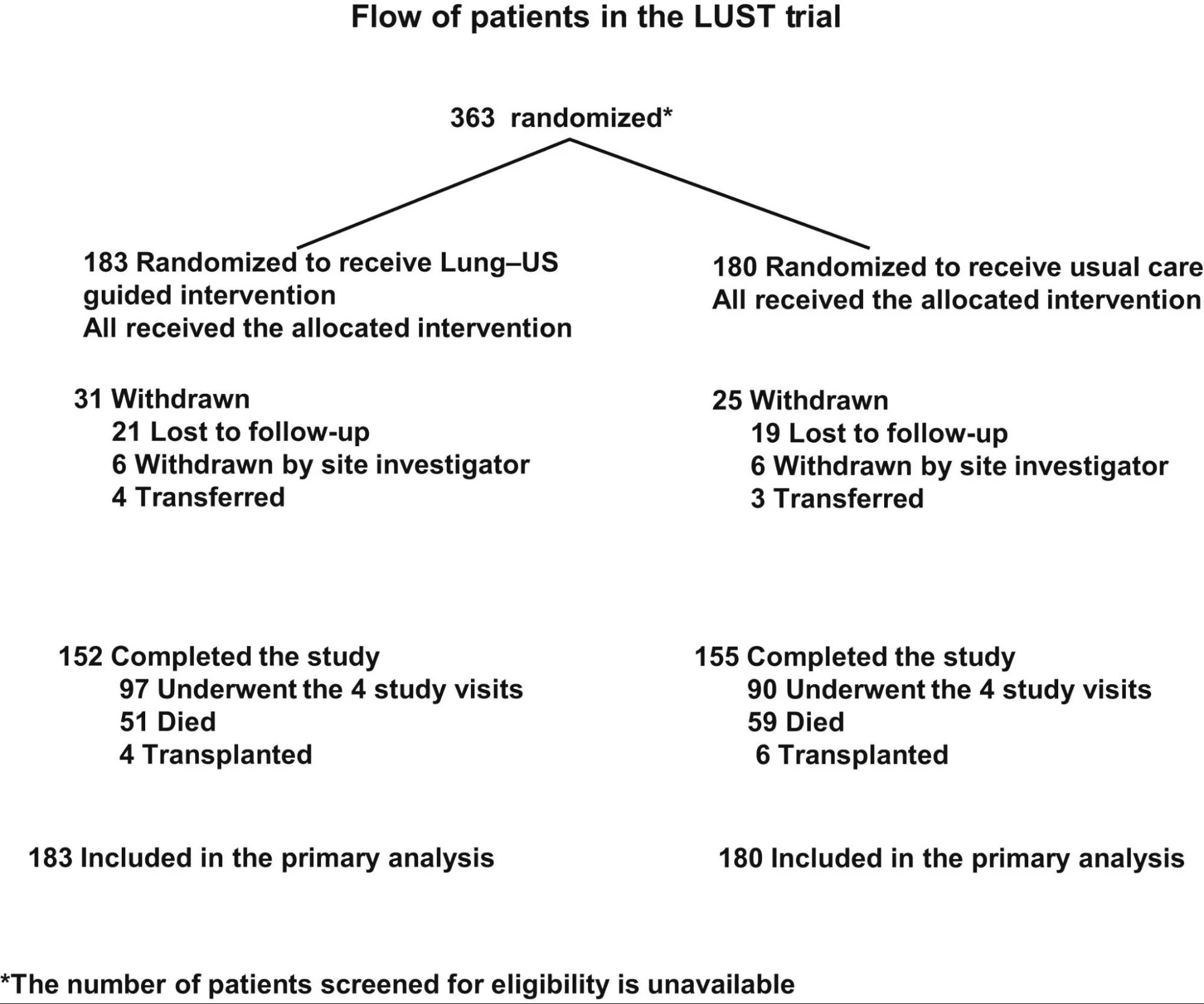 This left 183 in the lung US-guided therapy and 180 in the standard care. Interestingly enough, the figure 1 doesn’t follow CONSORT guidelines, and we don’t know the number of patients screened, eligible with reasons for exclusion, we only see the randomized N, as shown below.